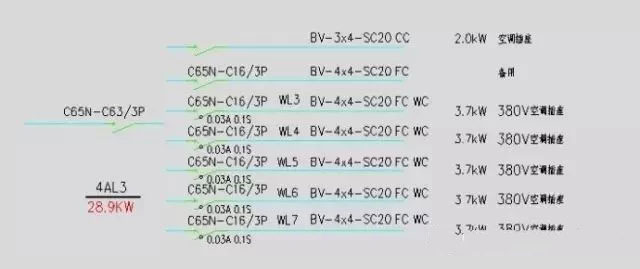 回路5中,斷電器型號(hào)為C65N,最大斷路電流為16A,采用4根線芯截面4mm2的銅芯聚氯乙烯絕緣電纜,穿直接20mm的鋼管,暗敷設(shè)在地面內(nèi)、墻內(nèi)。